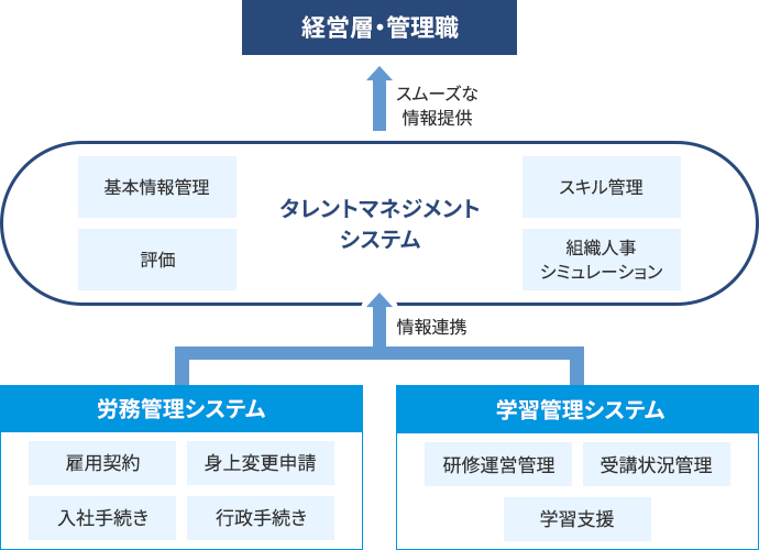 労務管理システム・学習管理システムは、採用から退職までの手続きや研修受講情報などを一気通貫でシステム化し、タレントマネジメントシステムへ連携しています。人材配置に必要な情報を総合的に可視化し、人事情報の集約および業務効率化を図っています。