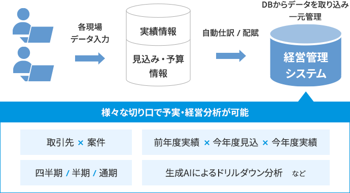 経営データは、日常的に様々な非定型の分析やドリルダウンと報告書作成が発生し、煩雑な業務によるリードタイム/工数増加、データ精度、属人化などの問題がありました。経営管理システムを導入しこれをDX化することで、正確かつスピーディな分析や将来予測・シミュレーションが可能となり、また属人化も解消でき、スタッフが戦略立案などのコア業務に集中できる環境を整備しました。