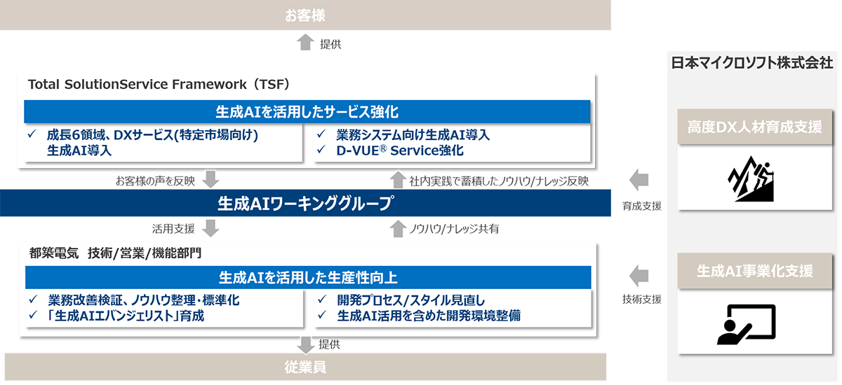 当社サービス体系である「Total Solution Service Framework」の各種サービスに「Azure OpenAI Service」を組み込み、生成AIを活用したサービス強化を行い、お客様に新しい価値を提供します。 - 生産性向上: 新技術に対する社内実践(検証・評価)及び、新技術を利用した業務効率化